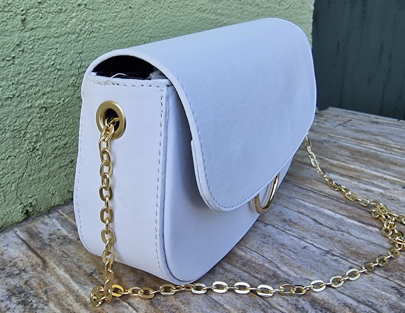 Дамска бяла кожена чанта със златиста метална катарама на лицевата й част. Закопчаване с две магнитни копчета.Метална дръжка с кожена част.