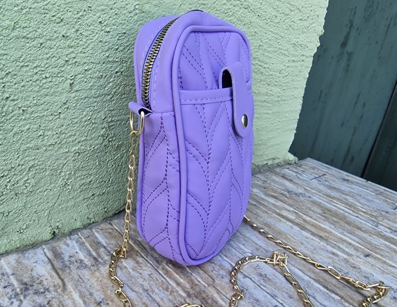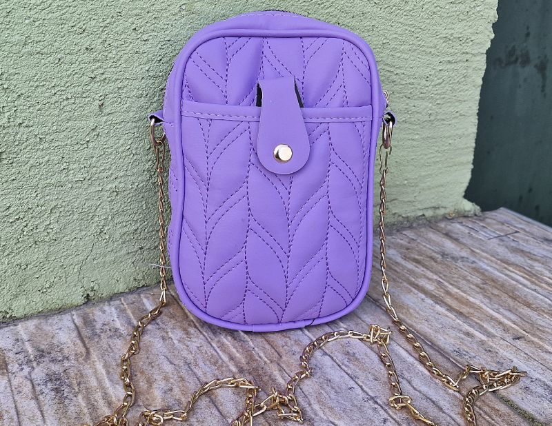 Дамска лилава кожена чанта с релефен шев. Едно голямо отделение, подходящо за портмоне и телефон и закопчаващо се със златост цип. Малко джобче на лицевата й част закопчаващо се с катарама с магнит копче. Метална дръжка.