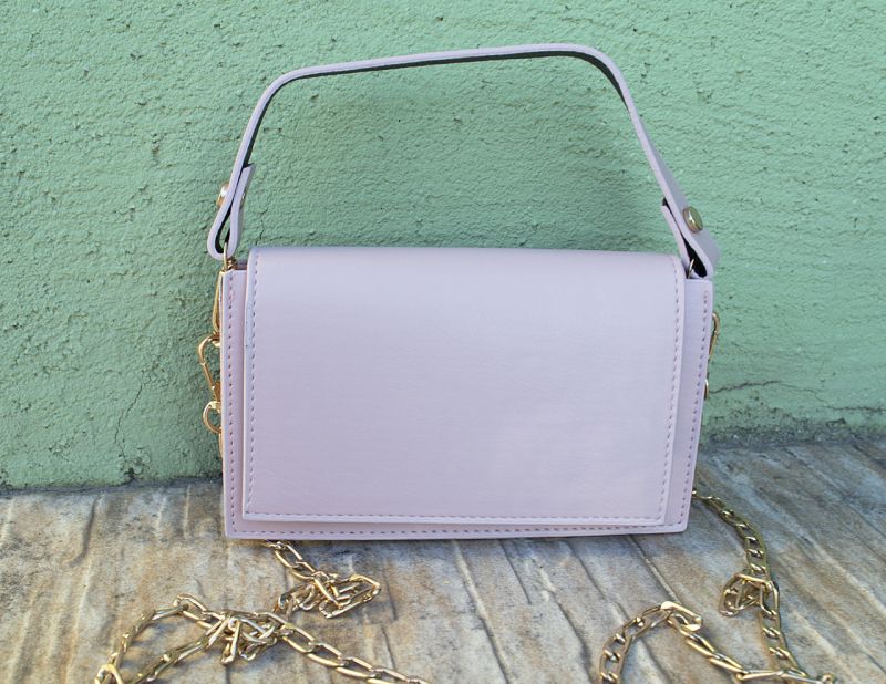 Дамска кожена чанта в светло розов цвят с едно голямо отделение, закопчаващо се на лицевата част с магнитно копче. Чантата е с два вида дръжки. Едната е къса , кожена , а другата е дълга метална в златист цвят.