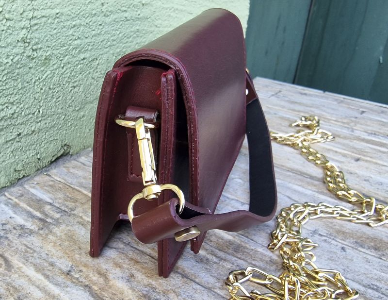 Дамска кожена чанта в стилен бургунди цвят с едно голямо отделение, закопчаващо се на лицевата част с магнитно копче. Чантата е с два вида дръжки. Едната е къса , кожена , а другата е дълга метална в златист цвят.