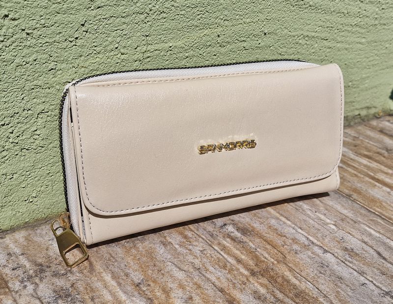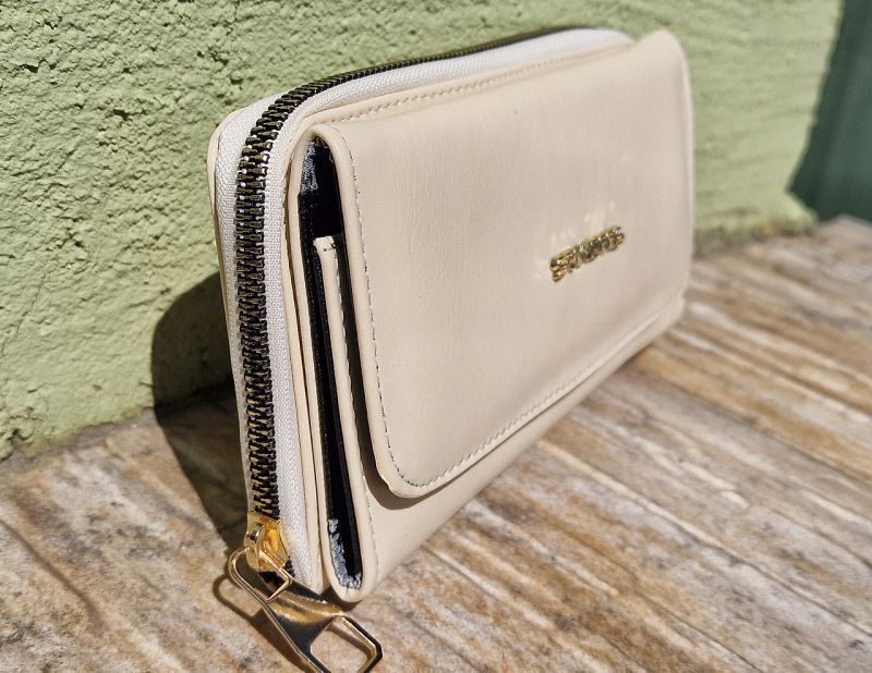 Дамско портмоне от мека кожа в светло бежов цвят. Лицевата част се закопчава със златисто метално копче, метална емблема. В тази част имате четири отделения за карти или документи, малки джобчета под тези отделения и едно голямо отделение с прозрачни джобчета подходящи за снимки на любимите хора. Задната част на портмонето се закопчава със златист цип. Тук имате две големи отделенията за пари и едно отделение за стотинки закопчаващо се с цип.