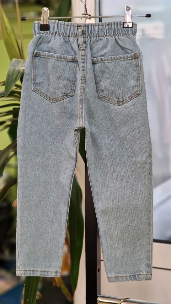 Светло сини дънки с апликации на крачолите. Лека вдигната талия с ластик е копче. Джобчета.