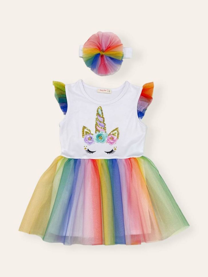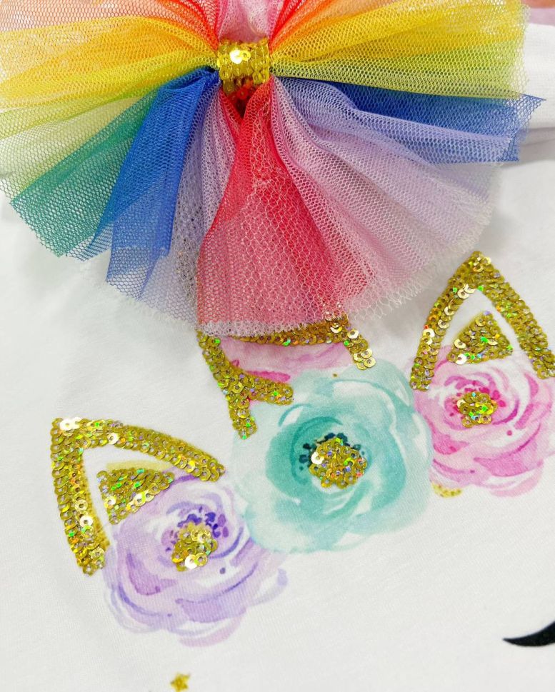 Бяла рокля с апикация на еднорог и обшити пайети.