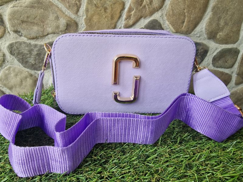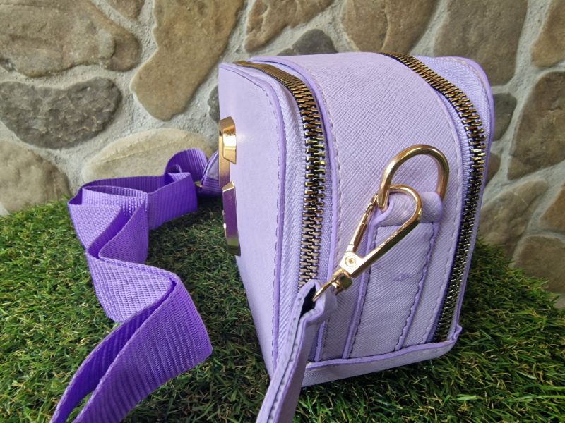 Светло лилава кожена чанта с метална златиста емблема на лицевата част. Едно отделение, закопчаващо се с два златисти ципа. Текстилна лилава дръжка с регулираща се дължина. На гърба има малко джобче.