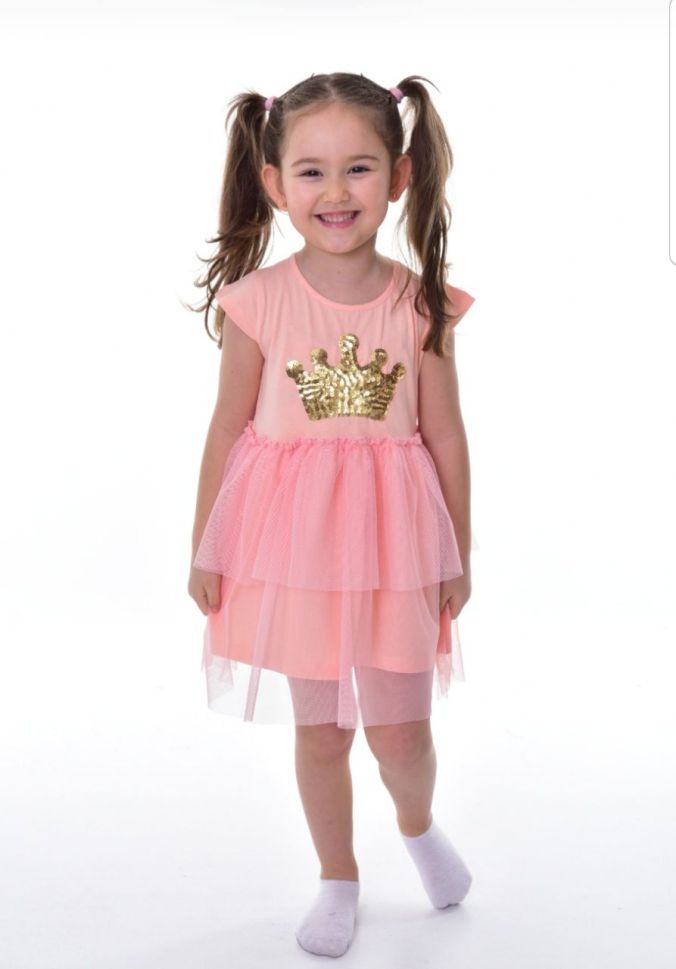 Прасковен цвят рокля с пришити пайети в горната й част.