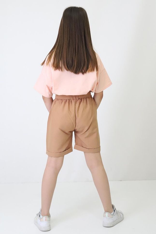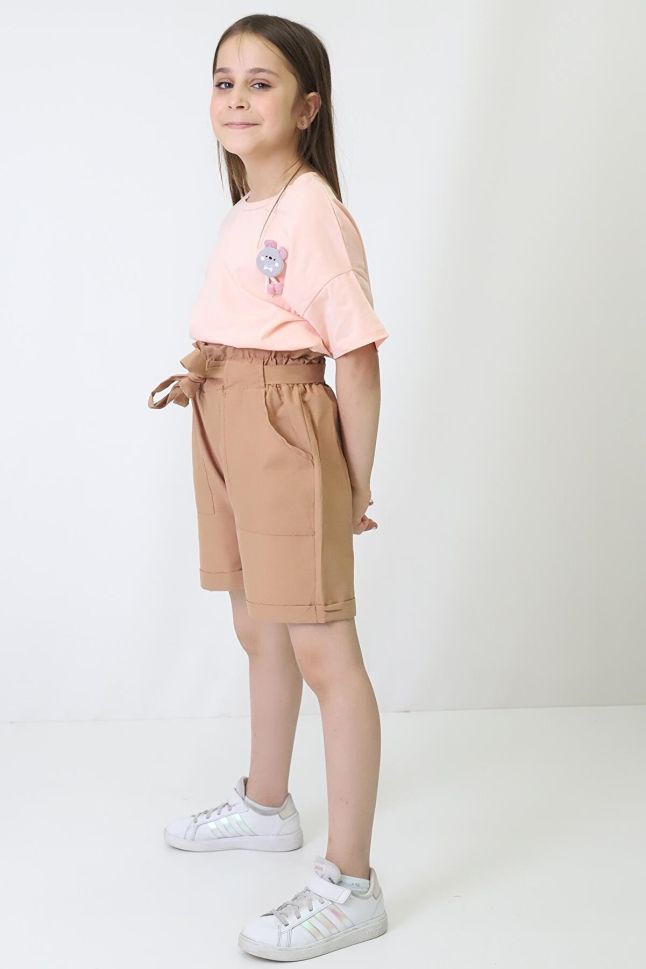 Къса тениска с ластик на талията и пришито декоративно мече.