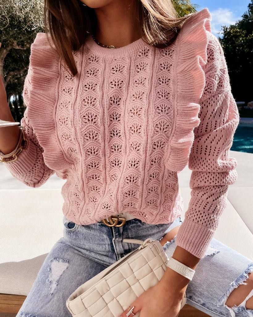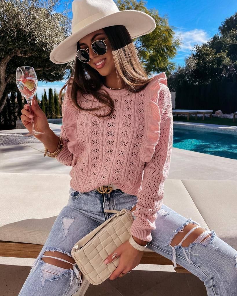 Дамски розов фигурален пуловер с къдрички на лицевата част.