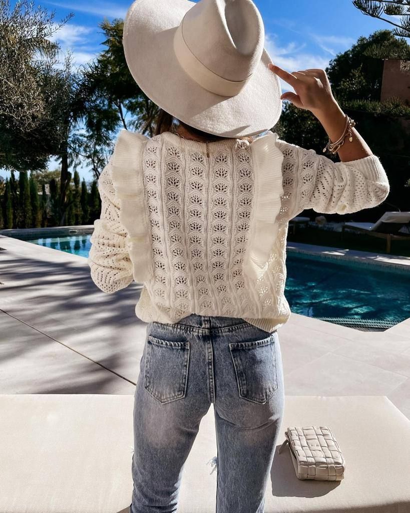 Дамски екрю цвят фигурален пуловер с къдрички на лицевата част.