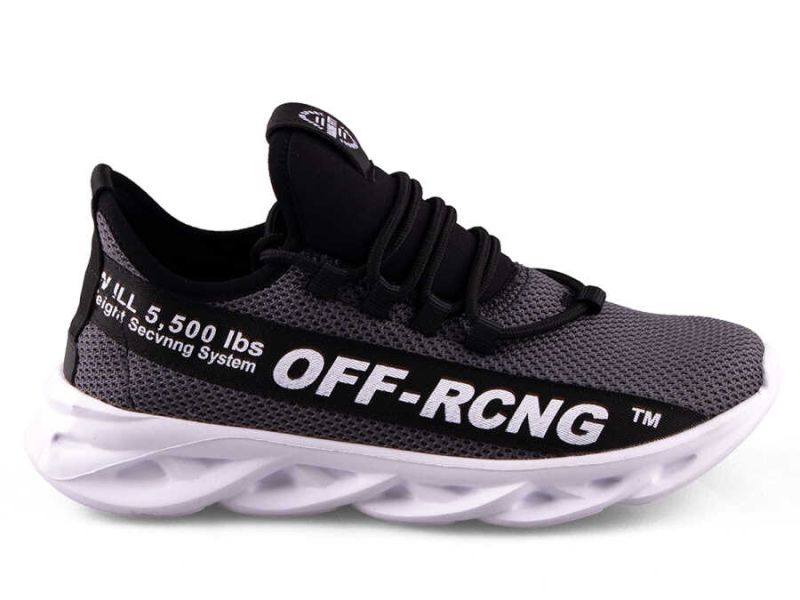 Сиви маратонки с горна трикотажна част и пришина черна лента с надписи. Завръзват се с черни връзки. Бяла подметка.