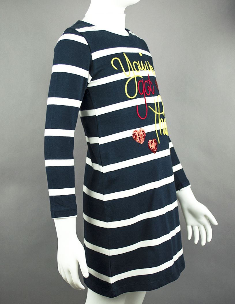 Синьо райе рокля с апликация и пришити пайети.