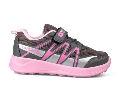 Сиви маратонки с розови странични ленти, връзки и закопчаване с лепенка.