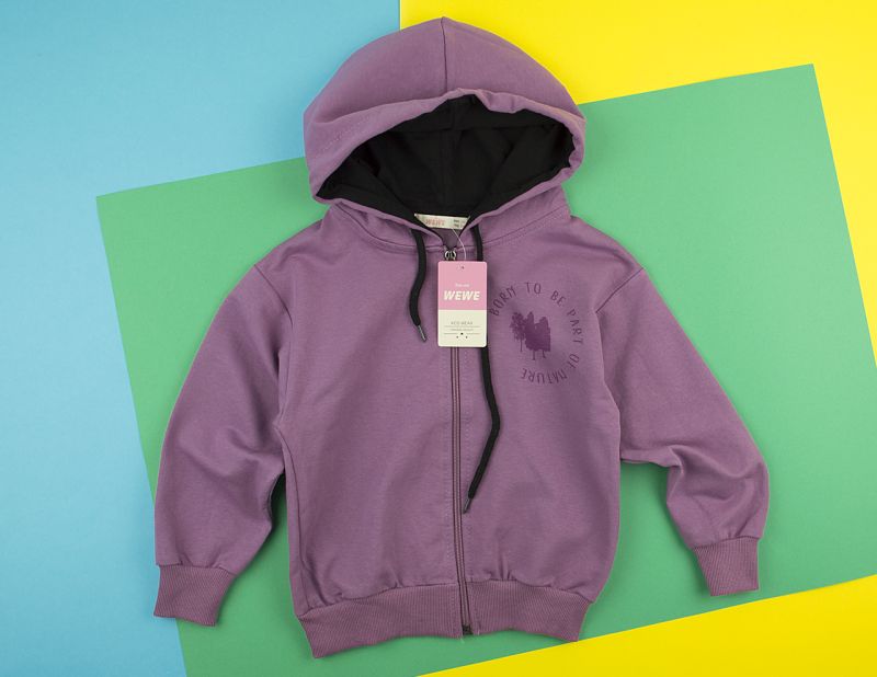 Лилав суитчер с качулка и закопчаване с цип на лицевата част.