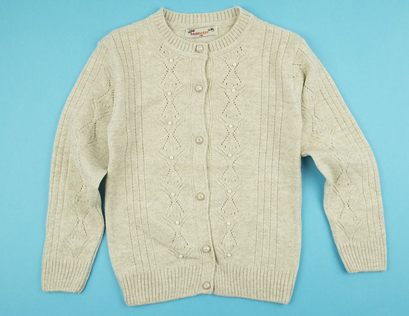 Бежов цвят фигурална плетена жилетка с перлички на лицевата част.